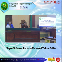 Jumat, 27 Februari 2026 bertempat di Ruang Sidang Cakra Pengadilan Negeri Wonogiri, telah dilaksanakan Rapat Rutin Bulanan Periode Bulan Februari 2026.Rapat dipimpin oleh Ketua Pengadilan Negeri Wonogiri, Bapak Andri Sufari, S.H., M.Hum. dan Didanpingi Oleh Wakil Ketua Pengadilan Negeri Wonogiri Bapak Purwanta, S.H., M.H. dan serta Hakim, Panitera , sekretaris, Pejabat Fungsional struktural, serta seluruh Pegawai Pengadilan Negeri wonogiri dalam acara tersebut juga dilaksanakan pemberian penghargaan/reward kepada Hakim dan Pegawai terbaik bulan Februari 2026