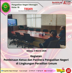 Selasa, 3 Maret 2026, Bertempat di Commad Center Ketua Pengadilan Negeri Wonogiri Bapak Andri Sufari S.H M.Hum bersama Panitera Bapak Darsono, S.H. Mengikuti KegiatanPembinaan Ketua dan Panitera Pengadilan Negeridi Lingkungan Peradilan Umum oleh Direktur Jenderal Badan Peradilan Umum Mahkamah Agung Republik Indonesia,H. Bambang Myanto, S.H., M.H. secara daring.