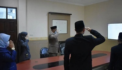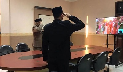 Dan pada sore harinya di tempat yang sama, Hakim-Hakim Pengadilan Negeri Wonogiri Kelas 1B secara virtual turut menghadiri Upacara Penurunan Bendera Merah Putih dalam rangka Peringatan Detik-Detik Proklamasi Kemerdekaan Republik Indonesia ke-77.