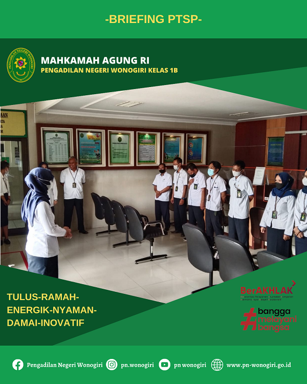 Hari Senin, tanggal 12 September 2022, Pengadilan Negeri Wonogiri Kelas 1B, mengadakan Briefing Rutin bagi Petugas PTSP dipimpin oleh Pejabat Pengelola PTSP, Sekretaris Pengadilan Negeri Wonogiri Kelas 1B Ibu Giyanti Kusmi Rahayu, S.Sos.