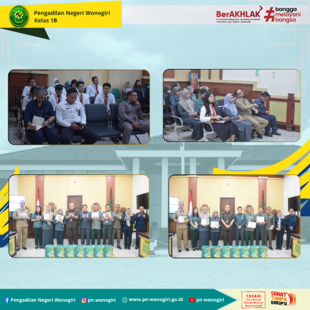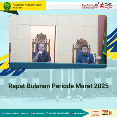 Pada hari Kamis, 25 Maret 2025. bertempat di Ruang Sidang Cakra Pengadilan Negeri Wonogiri, telah dilaksanakan Rapat Rutin Bulanan Periode Maret 2025. Rapat dipimpin oleh Ketua Pengadilan Negeri Wonogiri, Bapak Andri Sufari, S.H., M.Hum Rapat dihadiri oleh Wakil Ketua, Para Hakim, Panitera, Plh Sekretaris, Para Panitera Muda, Para Kasubag, ASN Pelaksana dan PPNPN Pada Pengadilan Negeri Wonogiri. Disamping itu diserahkan juga Penghargaan untuk Hakim, Panitera Pengganti, Petugaa PTSP, ASN dan PPNPN Terbaik. Adapun kategori penghargaan tersebut, yaitu : - Hakim Terbaik diberikan kepada Bapak Agusty Hadi Widarto,SH - PP Terbaik diberikan kepada Ibu Della Prehatini, S.H. - ASN Terbaik diberikan kepada Ibu Yulianti Tri Setiyawati, SH - Petugas PTSP Terbaik diberikan kepada Bapak Hari Waluyo - PPNPN Terbaik diberikan kepada Bapak Tugi Tri H Dengan adanya penghargaan tersebut, diharapkan dapat terus meningkatkan kinerja dan semangat kerja di Pengadilan Negeri Wonogiri dalam memberikan pelayanan terbaik bagi masyarakat.