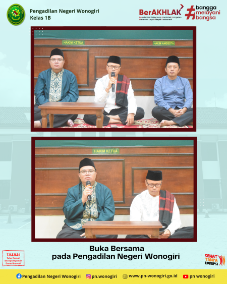Pada hari Rabu 19 Maret 2025 Bertempat di ruang Sidang Cakra telah dilaksanakan Tausiyah dan Buka Bersama yang diikuti oleh seluruh hakim dan aparatur Pengadilan Negeri Wonogiri. Kegiatan Tausiyah disampaikan oleh Bapak Muhammad Julianto, S.Ag., M.Ag.