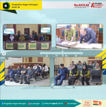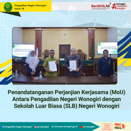 Bertempat di Ruang Sidang Cakra Pengadilan Negeri Wonogiri, telah dilaksanakan Penandatanganan Pengadilan Negeri Wonogiri dengan Sekolah Luar Biasa (SLB) Negeri Wonogiri. (Selasa, 15/4) Kerjasama ini untuk memberikan pelayanan yang maksimal kepada penyandang disabilitas pada Pengadilan Negeri Wonogiri.