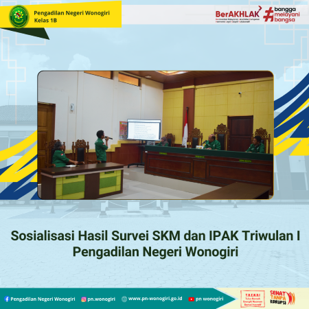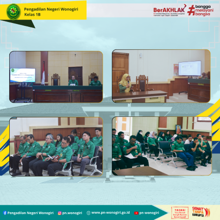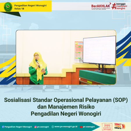 Rabu, 16 April 2025 bertempat di Ruang Sidang Cakra telah dilaksanakan Sosialisasi Standar Operasional Pelayanan (SOP) dan Manajemen Risiko yang disampaikan oleh Sekretaris Pengadilan Negeri Wonogiri Ibu Giyatmi Kusmi Rahayu, S.Sos. dan dilanjutkan dengan Sosialisasi Hasil Survei SKM dan IPAK Tahun 2025 Triwulan I yang disampaikan oleh Bapak Tri Handiyanto