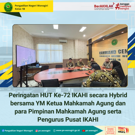 Rabu 23 April 2025 Pengadilan Negeri Wonogiri Kelas 1B menghadiri kegiatan puncak peringatan HUT Ke-72 IKAHI secara Hybrid bersama YM Ketua Mahkamah Agung dan para Pimpinan Mahkamah Agung serta Pengurus Pusat IKAHI yang diikuti oleh Ketua Pengadilan Negeri Wonogiri Bapak Andri Sufari S.H., M.Hum, Wakil Ketua Pengadilan Negeri Wonogiri Bapak Purwanta, S.H., M.H. serta seluruh Hakim. Kegiatan tersebut dilaksanakan di Ruang Command Center Pengadilan Negeri Wonogiri.