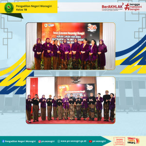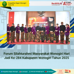 Bertempat di Pendopo Rumah Dinas Bupati Wonogiri pada Senin 19 Mei 2025 Ketua Pengadilan Negeri Wonogiri Bapak Andri Sufari S.H. M. Hum dan Ketua Dharmayukti Karini Cabang Wonogiri Ibu dr. Dewi Retno Andri Sufari menghadiri kegiatan Forum Silahturahmi Masyarakat Wonogiri dalam rangka Hari Jadi Ke-284 Kabupaten Wonogiri Tahun 2025. Tema peringatan Hari Jadi adalah Wonogiri, Berdaya Saing, Maju, Sejahtera dan Berkelanjutan, dengan slogan Ngrembaka Nirantara atau keberlanjutan dari keberhasilan yang diperoleh.Para hadirin mengenakan busana Kejawen, pria memakai beskap, berjarik, blangkon dan berkeris, serta perempuan berkebaya dan berjarik.