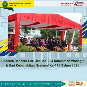 Ketua Pengadilan Negeri Wonogiri Bapak Andri Sufari, S.H.,M.Hum mengikuti Upacara Bendera Hari Jadi Ke-284 Kabupaten Wonogiri & Hari Kebangkitan Nasional Ke-117 Tahun 2025 pada Selasa, 20 Mei 2025. Kegiatan ini menjadi momentum refleksi atas semangat perjuangan masa lalu dan tekad untuk menjawab tantangan zaman.