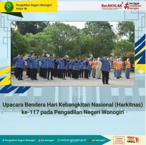 Selasa, 20 Mei 2025 bertempat di Halaman Pengadilan Negeri Wonogiri telah dilaksanakan upacara bendera dalam rangka memperingati Hari Kebangkitan Nasional (Harkitnas) ke-117. Upacara berlangsung khidmat di lapangan kantor Pengadilan Negeri Wonogiri dan diikuti oleh seluruh aparatur peradilan, baik hakim, pegawai, maupun tenaga pendukung lainnya.Bertindak sebagai Pembina upacara adalah Wakil Ketua Pengadilan Negeri Wonogiri, Bapak Purwanta, S.H., M.H. Dalam amanatnya, beliau menyampaikan pentingnya menjadikan momentum Hari Kebangkitan Nasional sebagai refleksi dan dorongan untuk terus berkontribusi dalam membangun bangsa, sesuai dengan tema peringatan tahun ini: “Bangkit Bersama Menuju Indonesia Kuat.”