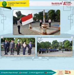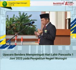 Senin, 1 Juni 2025 bertempat di Halaman Pengadilan Negeri Wonogiri telah dilaksanakan upacara bendera dalam rangka memperingati Hari Lahir Pancasila ke- 80 Upacara peringatan tahun ini mengusung tema "Memperkokoh Ideologi Pancasila Menuju Indonesia Raya". Upacara berlangsung khidmat di halaman kantor Pengadilan Negeri Wonogiri dan diikuti oleh seluruh aparatur Pengadilan Negeri Wonogiri, baik hakim, pegawai, maupun PPNPN. Bertindak sebagai Pembina upacara adalah Wakil Ketua Pengadilan Negeri Wonogiri, Bapak Purwanta, S.H., M.H. Dalam amanatnya, beliau menyampaikan pentingnya ideologi Pancasila sebagai fondasi kebangsaan, dengan lambang Burung Garuda Pancasila menjadi elemen utama. Garuda tidak hanya sebagai simbol kenegaraan, tetapi juga merepresentasikan semangat persatuan, kedaulatan, dan kemakmuran bangsa Indonesia."Garuda mencengkeram pita bertuliskan Bhinneka Tunggal Ika, yang merefleksikan peran Pancasila sebagai pemersatu dalam keberagaman"
