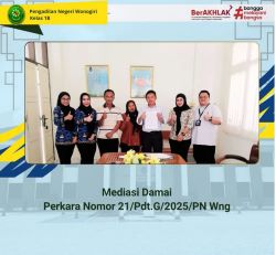 Senin, 2 Juni 2025, kembali mencatat keberhasilan dalam penyelesaian sengketa perkara perdata melalui mekanisme mediasi.Wakil Ketua Pengadilan Negeri Wonogiri Kelas 1B, Bapak Purwanta, S.H., M.H. selaku hakim mediator perkara perdata Nomor : 21/Pdt.G/2025/PN.Wng, berhasil mendamaikan para pihak yang berperkara. Sen