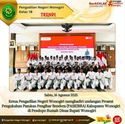 Sabtu 16 Agustus 2025, Ketua Pengadilan Negeri Wonogiri Bapak Andri Sufari S.H, M.Hum menghadiri undangan Prosesi pengukuhan Paskibra Kabupaten Wonogiri oleh Bupati Wonogiri di Pendopo Rumah Dinas Bupati Wonogiri. Anggota Paskibra yang terpilih dari siswa dan siswi sekolah tingkat SMA, SMK dan MA se-Kabupaten Wonogiri. Mereka nantinya akan bertugas sebagai pengibar Bendera Merah Putih pada upacara peringatan detik-detik Proklamasi Kemerdekaan Ke-80 Republik Indonesia di stadion Pringgondani, Wonogiri tanggal 17 Agustus 2025.