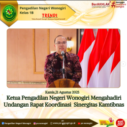 Kamis, 21 agustus 2025. Ketua Pengadilan Negeri Wonogiri Bapak Andri Sufari, S.H., M.Hum. Menghadiri Undangan Rapat Koordinasi Rakor Sinergitas Kamtibmas Untuk Mendukung Investasi Kabupaten Wonogiri diselenggarakan dengan tujuan merumuskan langkah-langkah strategis bersama lintas sektor untuk menjaga stabilitas keamanan dan ketertiban di seluruh wilayah Kabupaten Wonogiri, Kegiatan Tersebut diselenggarakan di Pendopo Rumah Dinas Bupati Wonogiri