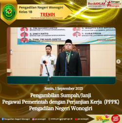 Pada hari Senin tanggal 01 September 2025, Bertempat Di Ruang sidang Cakra. Ketua Pengadilan Negeri wonogirBapak Andri Sufari, S.H, M.hum Mengambil Sumpah/Janji 7 ( Tujuh) Pegawai Pemerintah Dengan Perjanjian kerja. Acara diawali dengan pembacaan Surat Keputusan Sekretaris Mahkamah Agung, Dilanjutkan dengan Pengambilan Sumpah/Janji , dan Penandatanganan Fakta Integritas, Serta Ditutup dengan Amanat Ketua Pengadilan Negeri Wonogiri