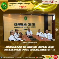 Senin, 6 Oktober 2025 Bertempat di Ruang Command Center Pengadilan Negeri Wonogiri, Ketua Pengadilan Negeri Wonogiri Bapak Andri Sufari S.H M.Hum bersama Panitera, dan Seluruh Panitera Muda mengikuti Pertemuan Rutin dan Sarasehan Interaktif Badan Peradilan Umum (Perisai Badilum) Episode ke - 10 dengan Tema Mengurai Kompleksitas Esekusi Perdata “ Problematika, Solusi dan Prospek Pembaruan Hukum” secara daring. Kegiatan Tersebut Bertujuan untuk mendorong kultur berdiskusi dan berpikir kritis ilmiah bagi para Hakim dan Tenaga Teknis di lingkungan Peradilan Umum.
