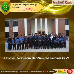 Selasa, 28 Oktober 2025, Pengadilan Negeri Wonogiri melaksanaan Upacara Bendera dalam rangka memperingati Hari Sumpah Pemuda ke 97. Bertindak sebagai Pembina Upacara yaitu Wakil Ketua Pengadilan Negeri Wonogiri Kelas IB, Bapak Purwanta, S.H., M.H. serta sebagai Komandan Upacara yaitu Bapak Dwiyanto. Upacara berjalan dengan khidmat dan diikuti oleh seluruh pegawai Pengadilan Negeri Wonogiri.
