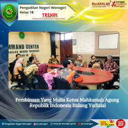 Jum'at, 28 November 2025 Bertempat di Ruang Command Center Pengadilan Negeri Wonogiri, Ketua Pengadilan Negeri Wonogiri Bapak Andri Sufari, S.H, M.Hum beserta Para Hakim, Panitera, Sekretaris dan Para Panitera Muda, Para Kasubag mengikuti Pembinaan Yang Mulia Wakil Ketua Mahkamah Agung Republik Indonesia Bidang Yudisial Bapak Suharto, S.H., M.Hum. secara daring. Kegiatan Pembinaan diharapkan menjadi sarana penyampaian arahan langsung mengenai penerapan kebijakan yudisial, tata kelola peradilan yang efektif, penyelesaian perkara yang berkeadilan, serta penguatan integritas aparatur.