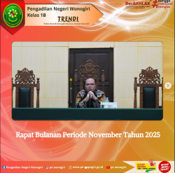 Jum'at, 28 November 2025 bertempat di Ruang Sidang Cakra Pengadilan Negeri Wonogiri, telah dilaksanakan Rapat Rutin Bulanan Periode Bulan November 2025.Rapat dipimpin oleh Ketua Pengadilan Negeri Wonogiri, Bapak Andri Sufari, S.H., M.Hum. dan Dikuti oleh Hakim, Panitera , sekretaris, Pejabat Struktural Fungsional , serta seluruh ASN Pengadilan Negeri wonogiri dalam acara tersebut juga dilaksanakan pemberian penghargaan/reward kepada Hakim dan Pegawai terbaik bulan November tahun 2025